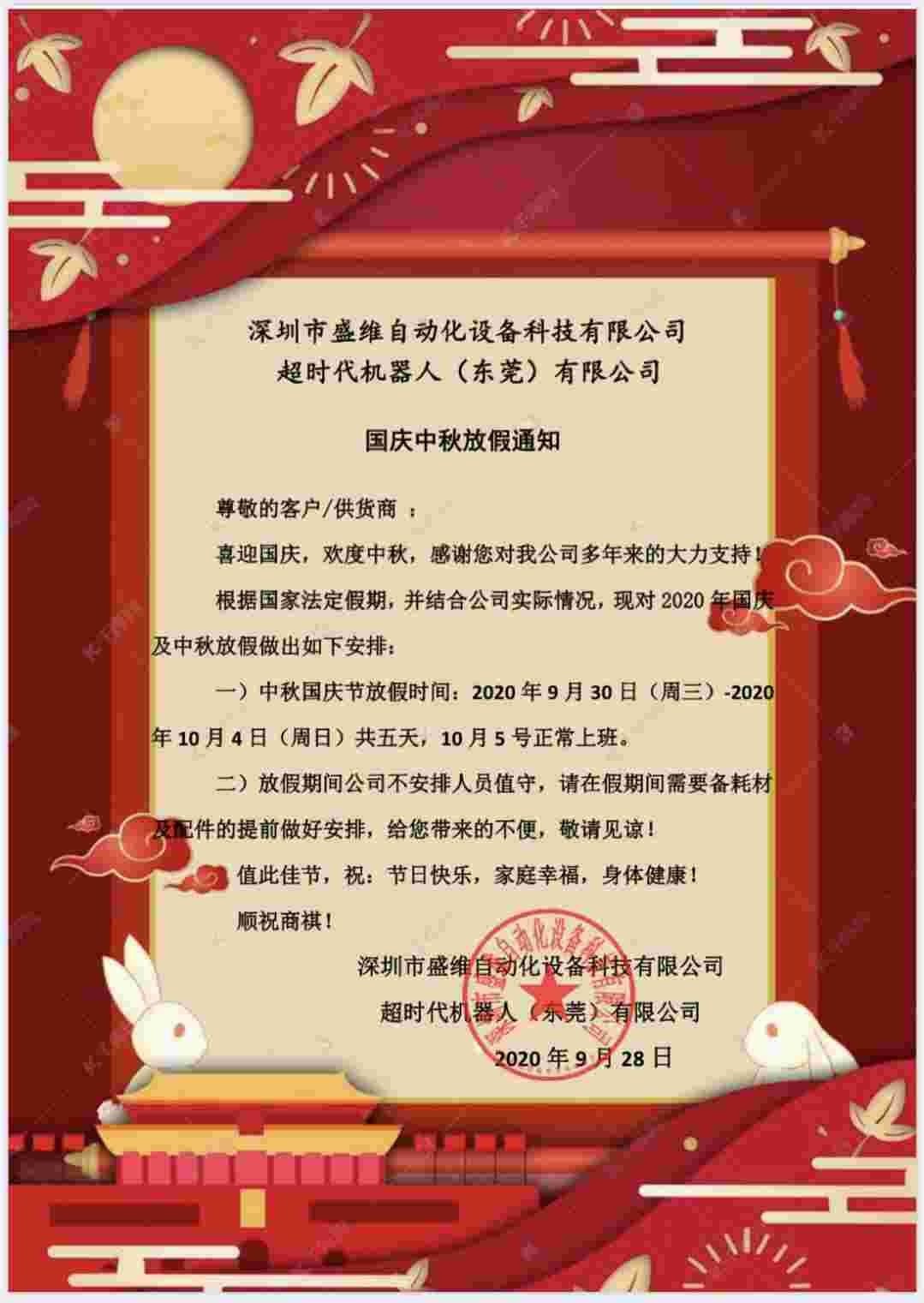 2020年9月30日~2020年10月4日為公司放假時間,其間不安排人員值班,感謝理解與支持